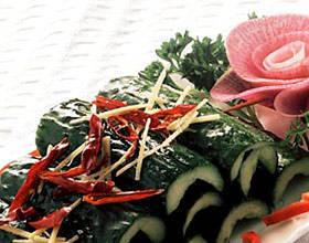 清拌黄瓜片   制作工艺:拌 口味:清香味   主料:黄瓜200克 配料: 调料:盐3克 白砂糖5克 香油5克 味精2克   黄瓜洗净,纵向对开成两半,去籽,再切成薄片,放干净盘内,加入精盐拌匀腌15钟,滤去盐水装盘,加入白糖、香油、味精拌匀即成。