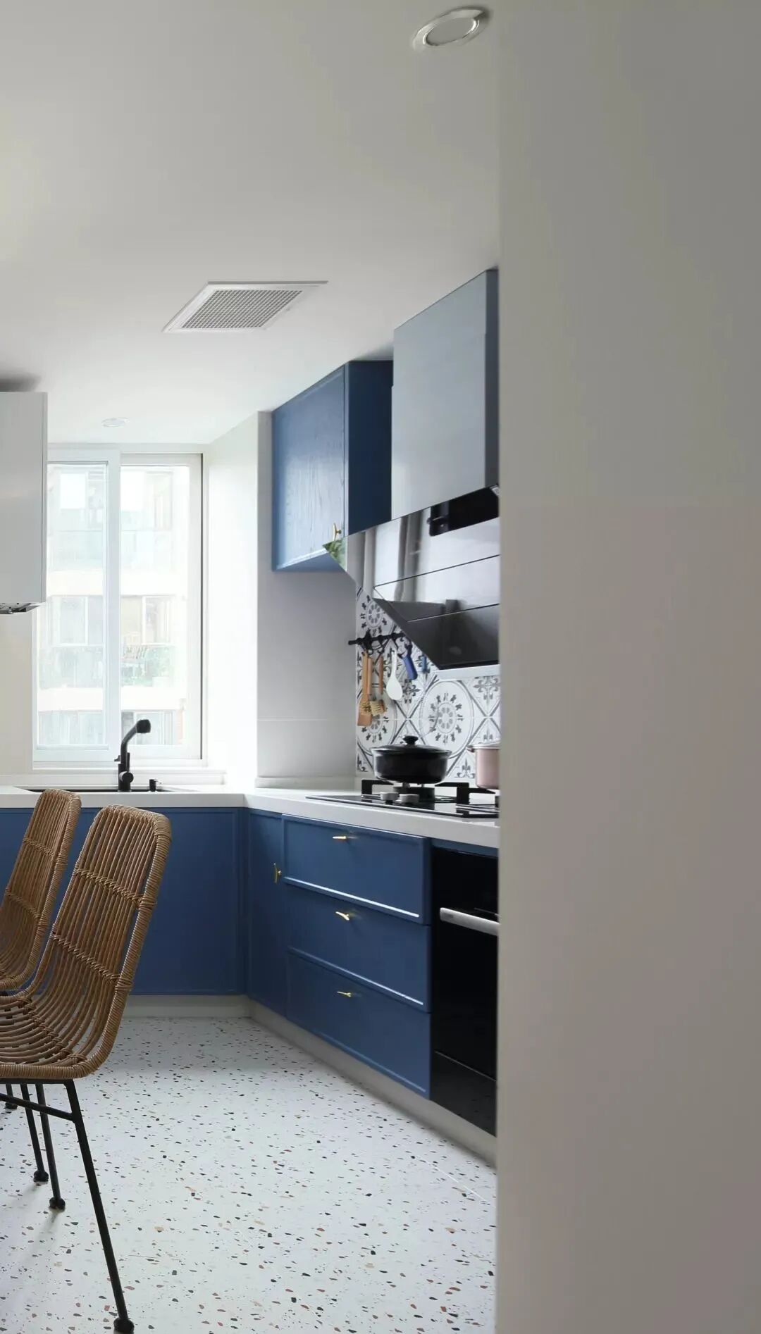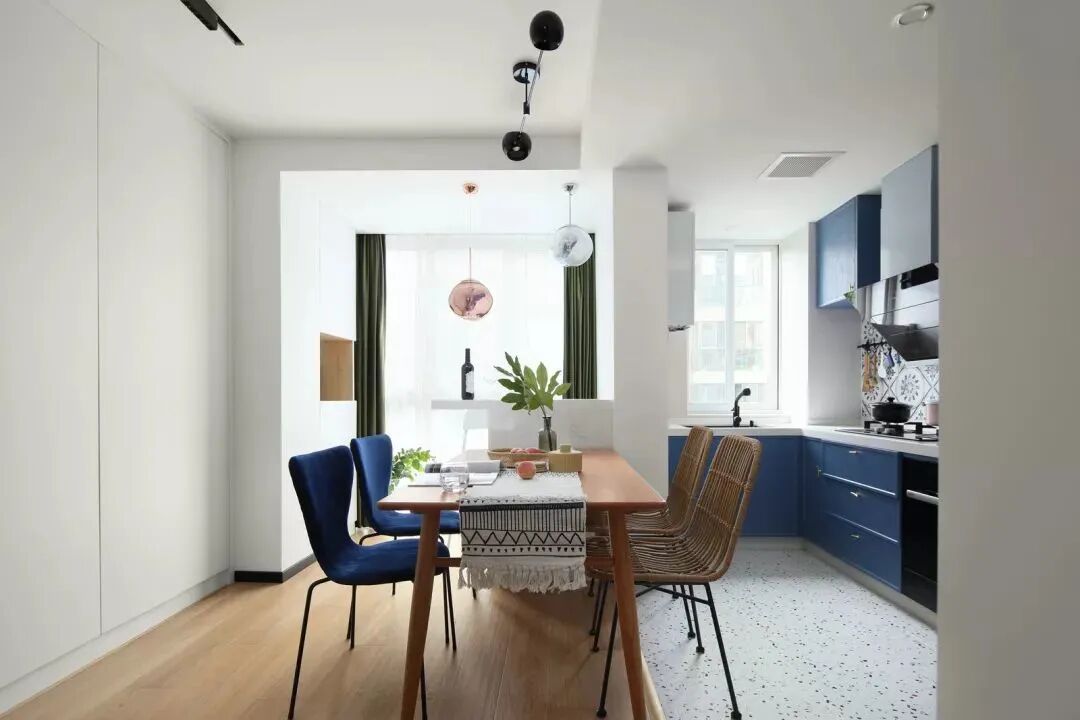 现在生活节奏快,许多人回到家,只想安安静静地窝着,希望家能让整个人把在外忙碌焦虑的心给平息下来。今天给大家介绍一个现代简约的家。一进门面对的是餐厅,餐桌和餐椅的挑选也是用了心思,并不是全部都与餐桌材质一致选择了木椅,而是在配色上与厨房的颜色做呼应,木色与宝蓝色碰撞也非常和谐。餐厅和客厅由吧台连接,可以在吧台上吃饭,或者是放置物品。厨房是半开放设计,L型操作台,并没有装门。墙上是花纹瓷砖,橱柜和收纳柜都是宝蓝色,地砖也是白底墨点设计的瓷砖。整个房间,颜色少,现代风满满。客厅与阳台一体,阳台上的吊椅,看起来十分惬意。茶几和电视柜以及电视柜旁边的斗柜都是木质的,给人安逸的感觉。沙发背景墙与沙发的颜色呼应,木色与高饱和度撞色的设计富有个性。过道的地板也是跟客厅餐厅一样的款式材质,灯具选用的是不规则灯带,具有艺术感。
