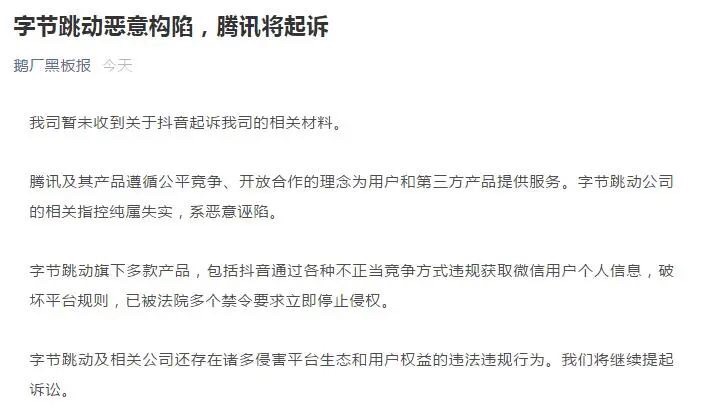 腾讯方面回应称:我司暂未收到关于抖音起诉我司的相关材料。腾讯及其产品遵循公平竞争、开放合作的理念为用户和第三方产品提供服务。字节跳动公司的相关指控纯属失实,系恶意诬陷。