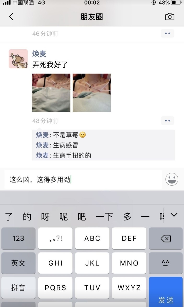 说是不是草莓,说自己生病手扭的。我咋就这么不相信呢,你们有听说过生病扭脖子的说法吗?