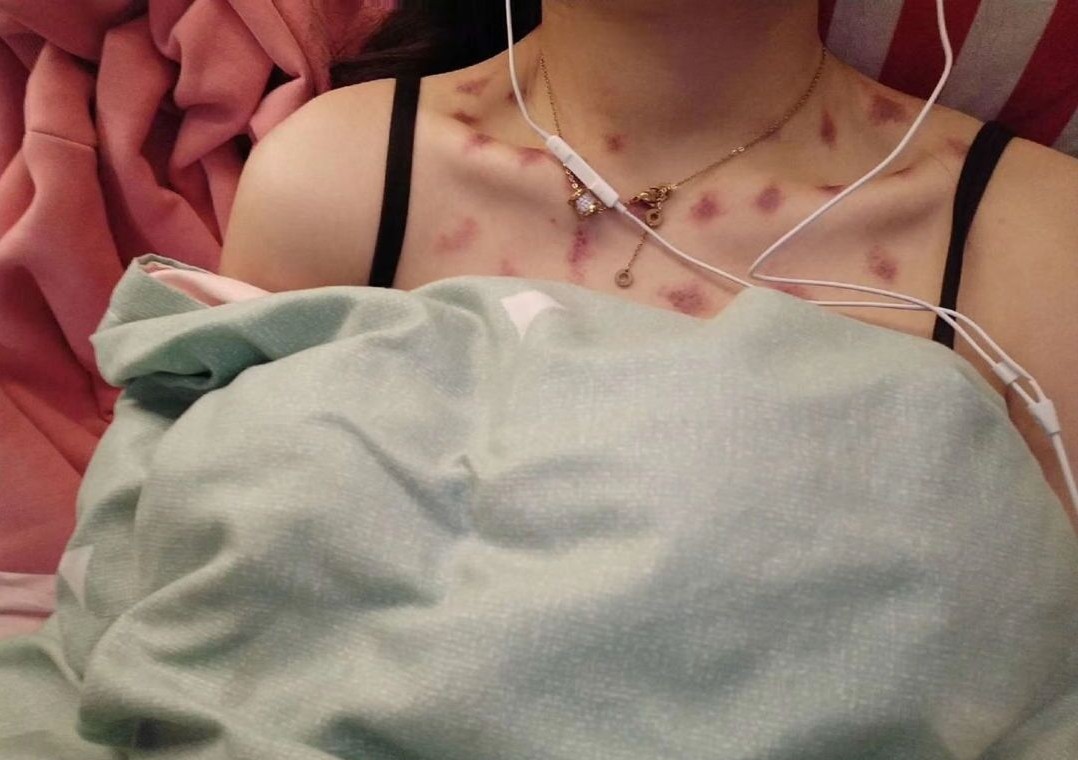 微博上别人发的,感觉有点狠啊,脖子锁骨那都是红色的痕迹,看着就疼