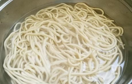 第三步,在锅中添上水,加上一点点食盐,待将水烧至90度的时候,将面条下入锅中开始煮,用筷子搅拌下防止粘锅,直到将面条煮至9成熟的时候;