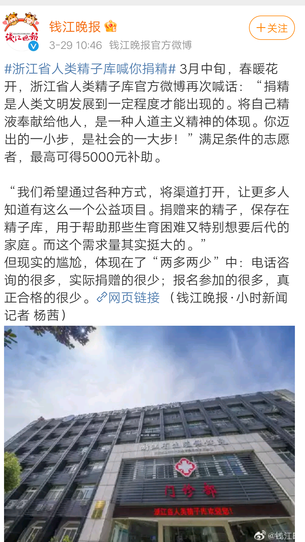3月中旬,春暖花开,浙江省人类精子库官方微博再次喊话:“捐精是人类文明发展到一定程度才能出现的。将自己精液奉献给他人,是一种人道主义精神的体现。你迈出的一小步,是社会的一大步!”满足条件的志愿者,最高可得5000元补助。