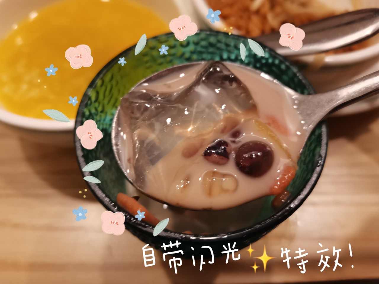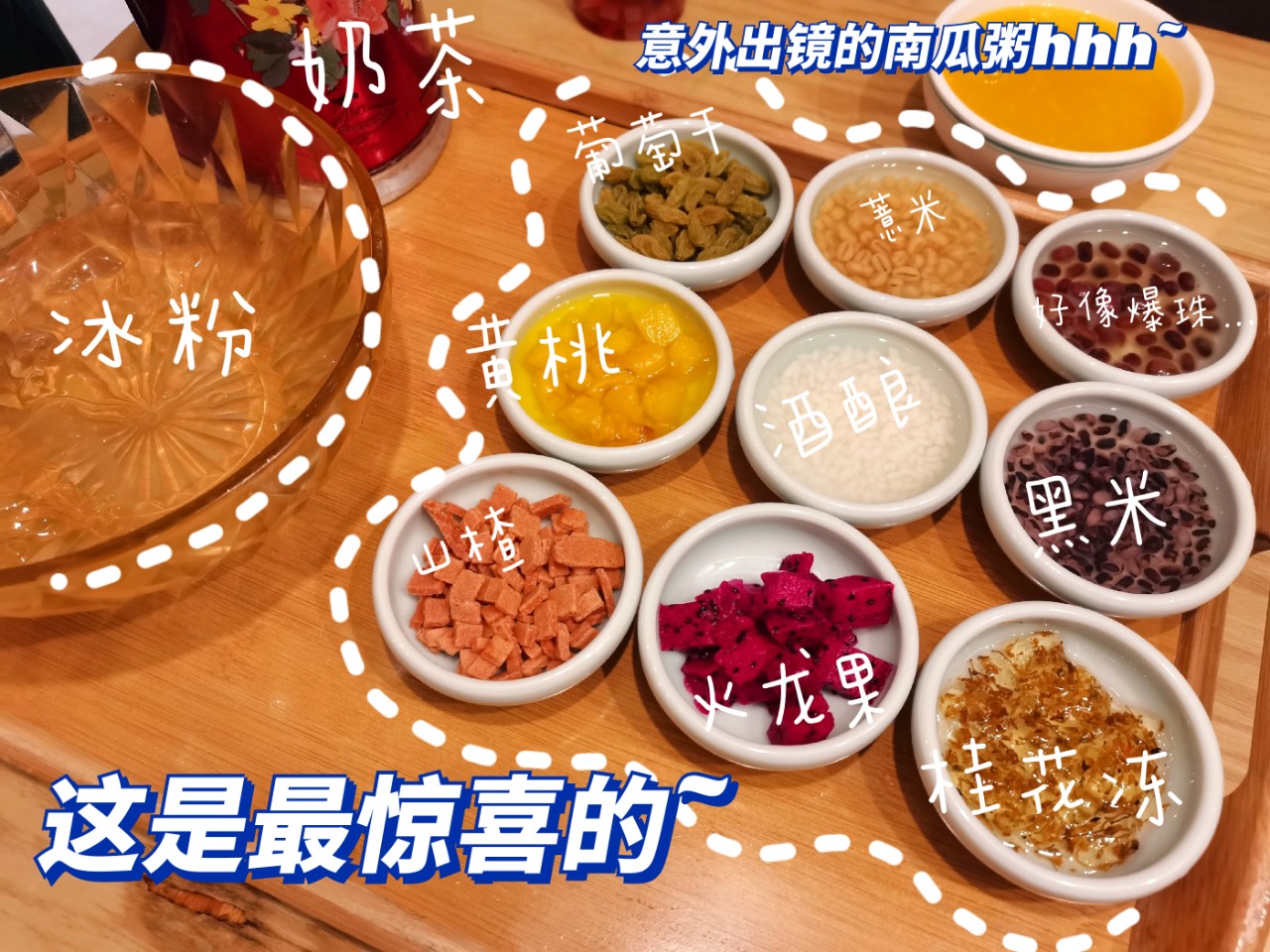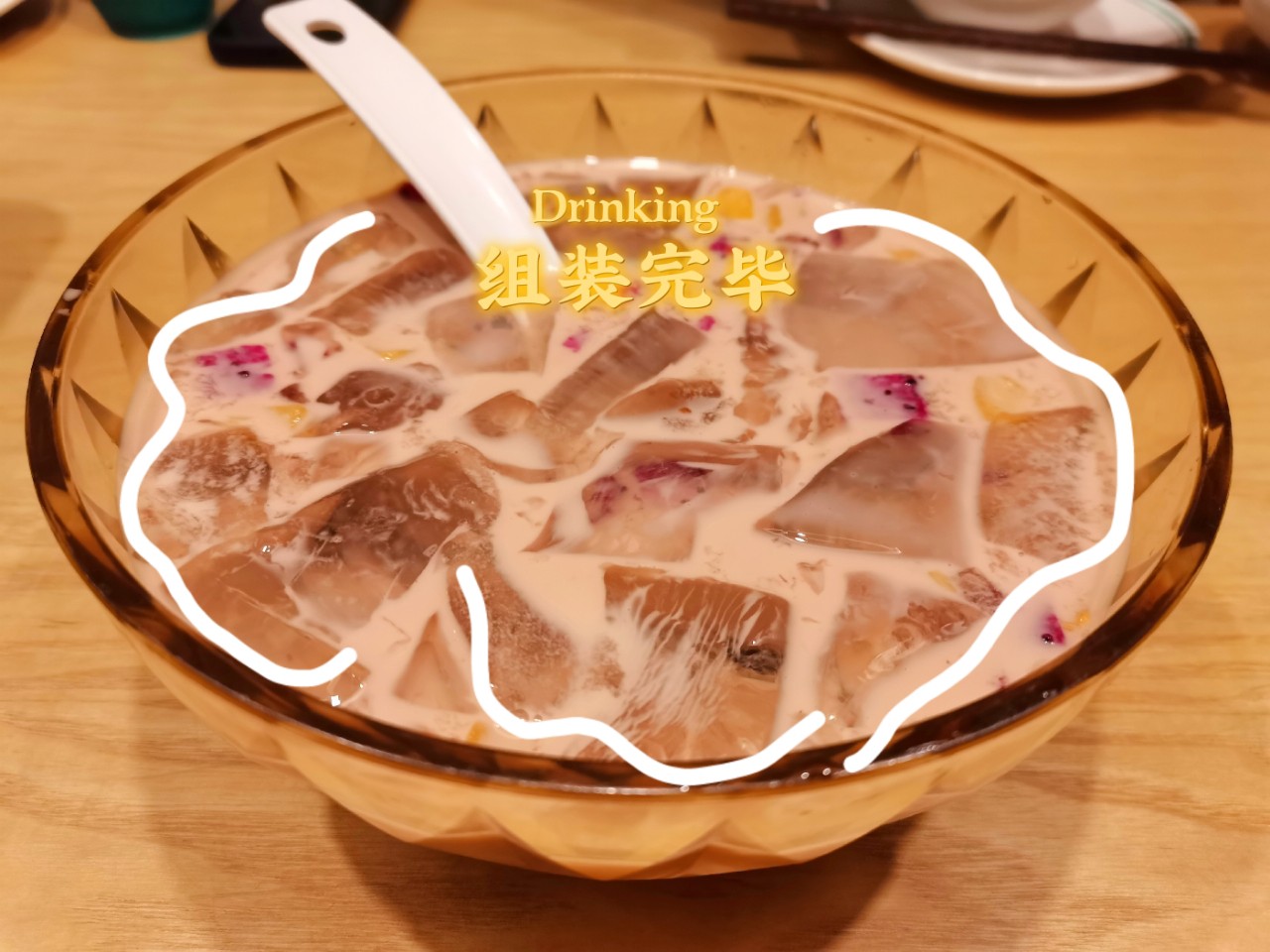 这个是我觉得的全场最佳hhhh加料有九样,蛮丰富,在搅和之前服务员会问有没有哪个不加的,奶茶约七分甜,喝起来顺滑偏凉,有着淡淡的奶香果香,冰粉混杂着小料,一口下去丰富还解渴解腻~