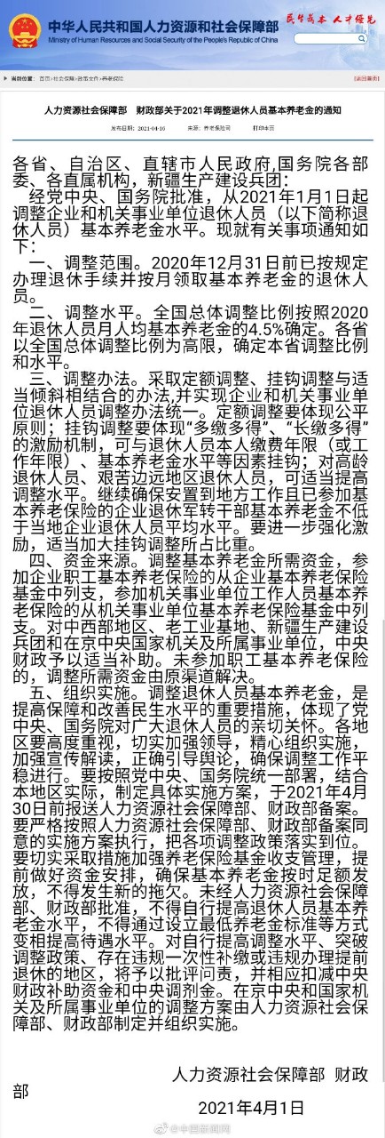 人力资源社会保障部、财政部近日印发《关于2021年调整退休人员基本养老金的通知》,明确从2021年1月1日起,为2020年底前已按规定办理退休手续并按月领取基本养老金的企业和机关事业单位退休人员提高基本养老金水平,总体调整水平为2020年退休人员月人均基本养老金的4.5%。来源:中国新闻网