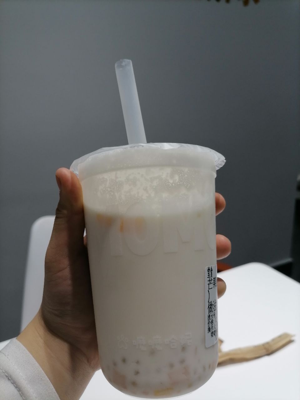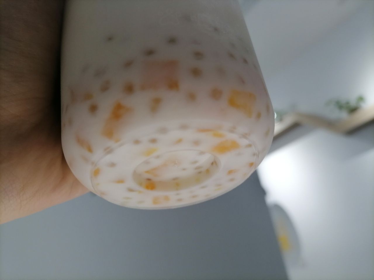 我还点了一杯芒果椰汁西米露,绝了!喝完满嘴都是椰汁的香气,西米露凉凉的,滑滑地溜进口腔中,芒果粒很多颗,喝起来超满足,如下图,依稀可见的满满的料!