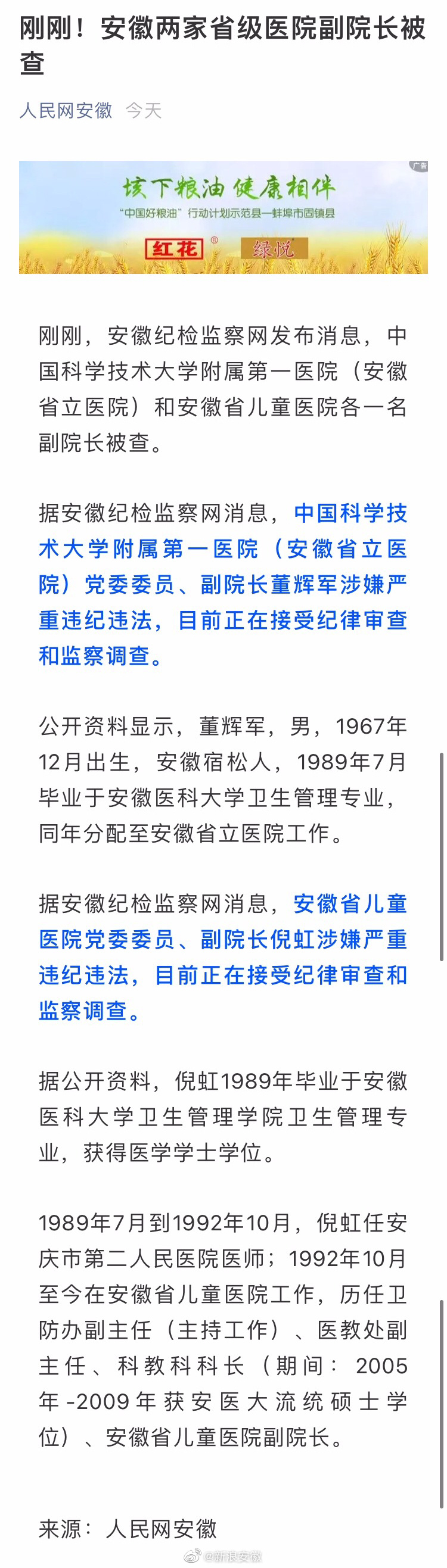 安徽省儿童医院党委委员、副院长倪虹涉嫌严重违纪违法,目前正在接受纪律审查和监察调查。