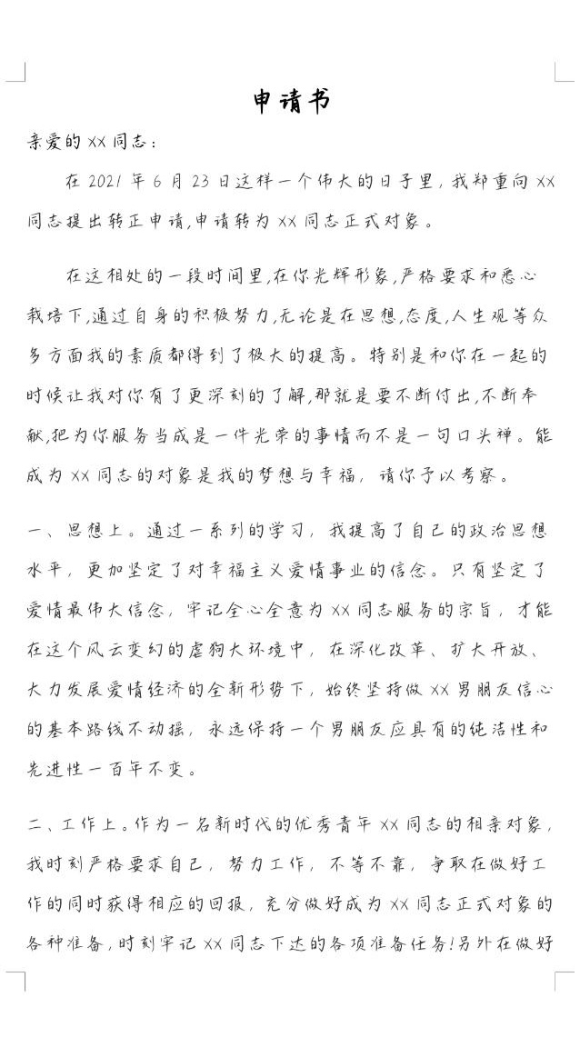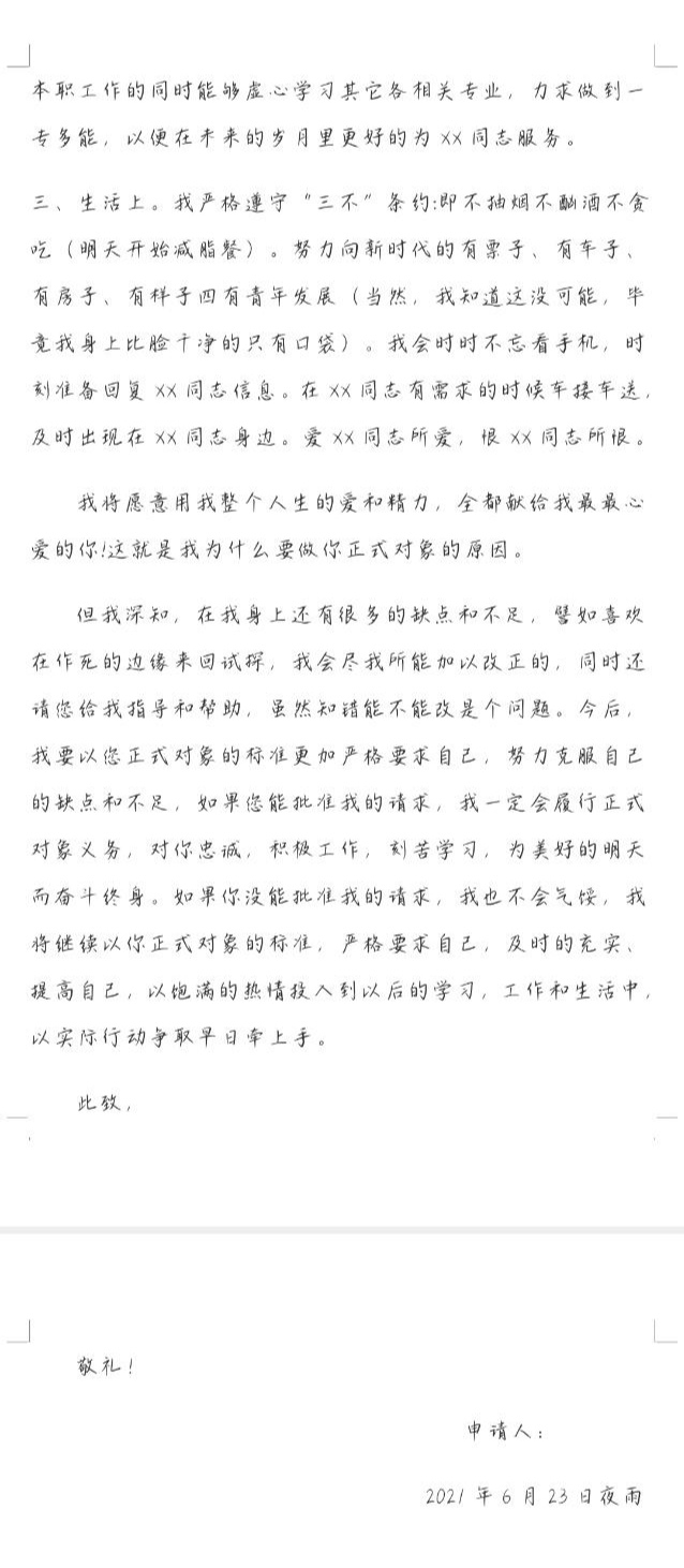 第一次看到这样的表白,写一份申请书,哈哈哈哈,和他相亲认识的,有段时间了,不过看在他这么认真的份上,恭喜你啦小x同志,成功转正成为我男朋友啦,以后继续努力