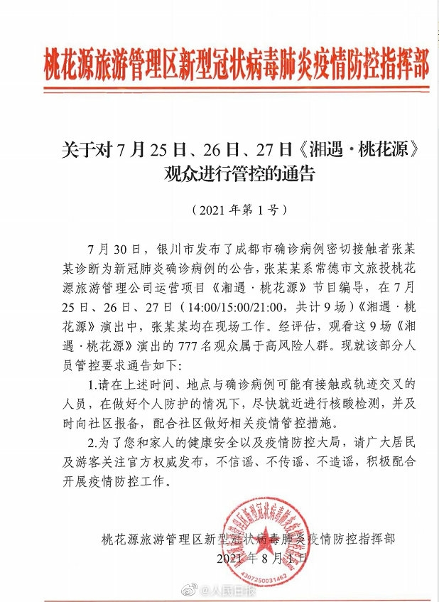 【转扩!#湖南桃花源9场演出777名观众属高风险#人群,请及时报备!】8月1日,湖南常德桃花源旅游管理区疫情防控指挥部发布公告:7月30日,银川市发布了成都市确诊病例密切接触者张某某诊断为确诊病例的公告,张某某系常德市文旅投桃花源旅游管理公司运营项目《湘遇·桃花源》节目编导,在7月25日、26日、27日(14:00/15:00/21:00,共计9场)《湘遇·桃花源》演出中,张某某均在现场工作。经评估,观看这9场《湘遇·桃花源》演出的777名观众属于高风险人群。请在上述时间、地点与确诊病例可能有接触或轨迹交叉的人员,在做好个人防护的情况下,尽快就近进行核酸检测,并及时向社区报备,配合社区做好相关疫情管控措施。(人民日报记者孙超)