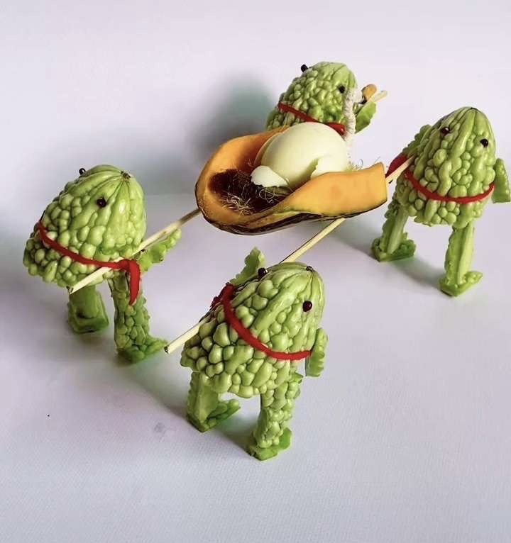 做这个的人真是个人才,用苦瓜做癞蛤蟆,挺会玩,造型还挺像的,颜色差点意思