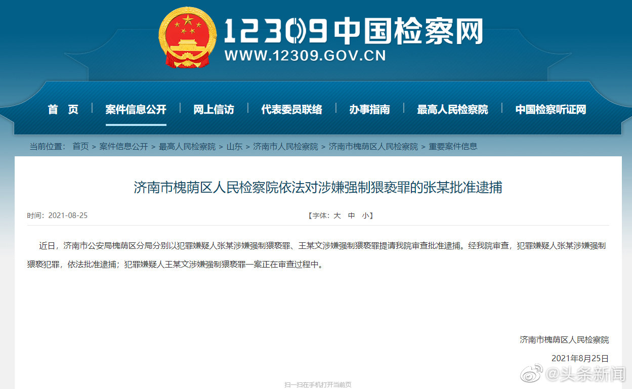 据中国检察网消息:近日,济南市公安局槐荫区分局分别以犯罪嫌疑人张某涉嫌强制猥亵罪、王某文涉嫌强制猥亵罪提请我院审查批准逮捕。经我院审查,犯罪嫌疑人张某涉嫌强制猥亵犯罪,依法批准逮捕;犯罪嫌疑人王某文涉嫌强制猥亵罪一案正在审查过程中。
