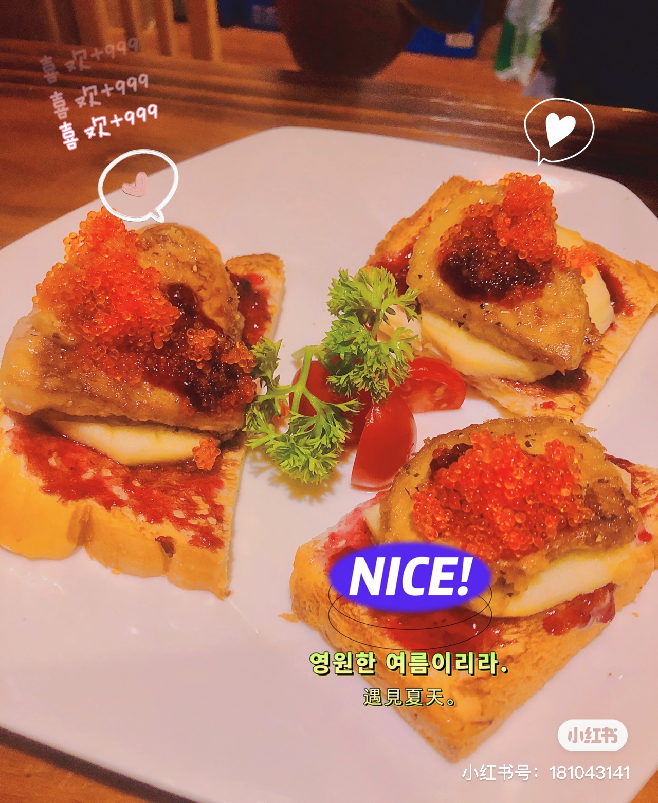 3:鹅肝,闭眼点,绝对惊艳全场!如图所示,最上面一层是大块鹅肝,鱼子点缀,中间是脆脆甜甜的苹果和黄梨片,最底下的是面包,淋的蓝莓酱,哇……yyds