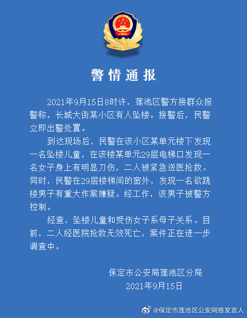 河北保定,将孩子从29楼扔下并捅伤妻子的男子,六点左右已被警方带走。此前,他曾在29楼窗台外意图跳楼,和警方对峙。15日早晨,河北保定一小区内一对夫妻吵架,丈夫将孩子从29楼扔下并捅伤妻子。