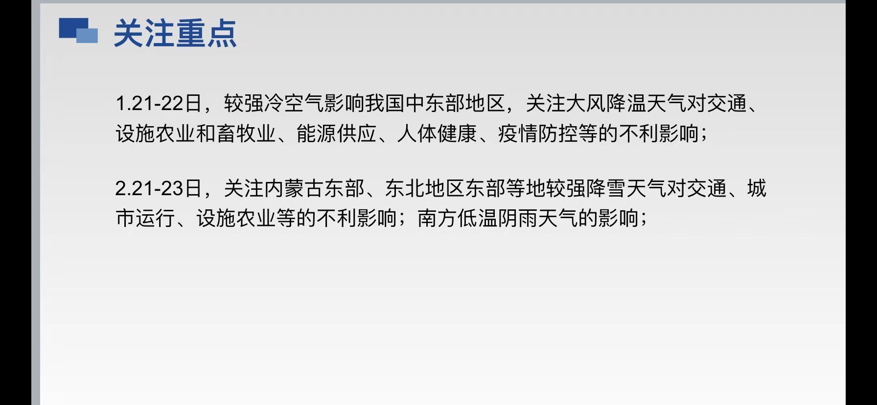 今日小雨转多云,偏北风4级左右,阵风7级,16~3℃;22日多云,11~-2℃;23-27日晴到多云。关注重点早晨大别山区和沿江江南西部有雾,请注意交通安全。21-22日我省降温剧烈,需关注强降温对能源保障、人体健康、疫情防控的不利影响21-22日全省阵风风力大,需提前加固广告牌、临时构筑物,尽量避免水面和高空作业,做好大风的防御措施。