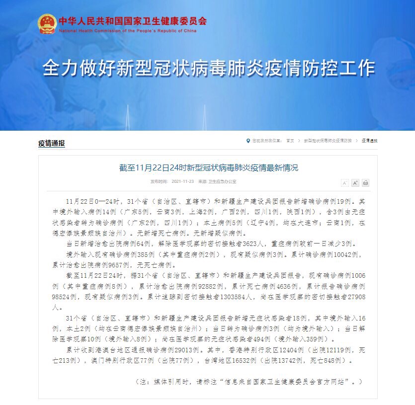 11月22日0—24时,31个省(自治区、直辖市)和新疆生产建设兵团报告新增确诊病例19例。其中境外输入病例14例(广东5例,云南3例,上海2例,广西2例,四川1例,陕西1例),含3例由无症状感染者转为确诊病例(广东2例,四川1例);本土病例5例(辽宁4例,均在大连市;云南1例,在德宏傣族景颇族自治州)。无新增死亡病例。无新增疑似病例。