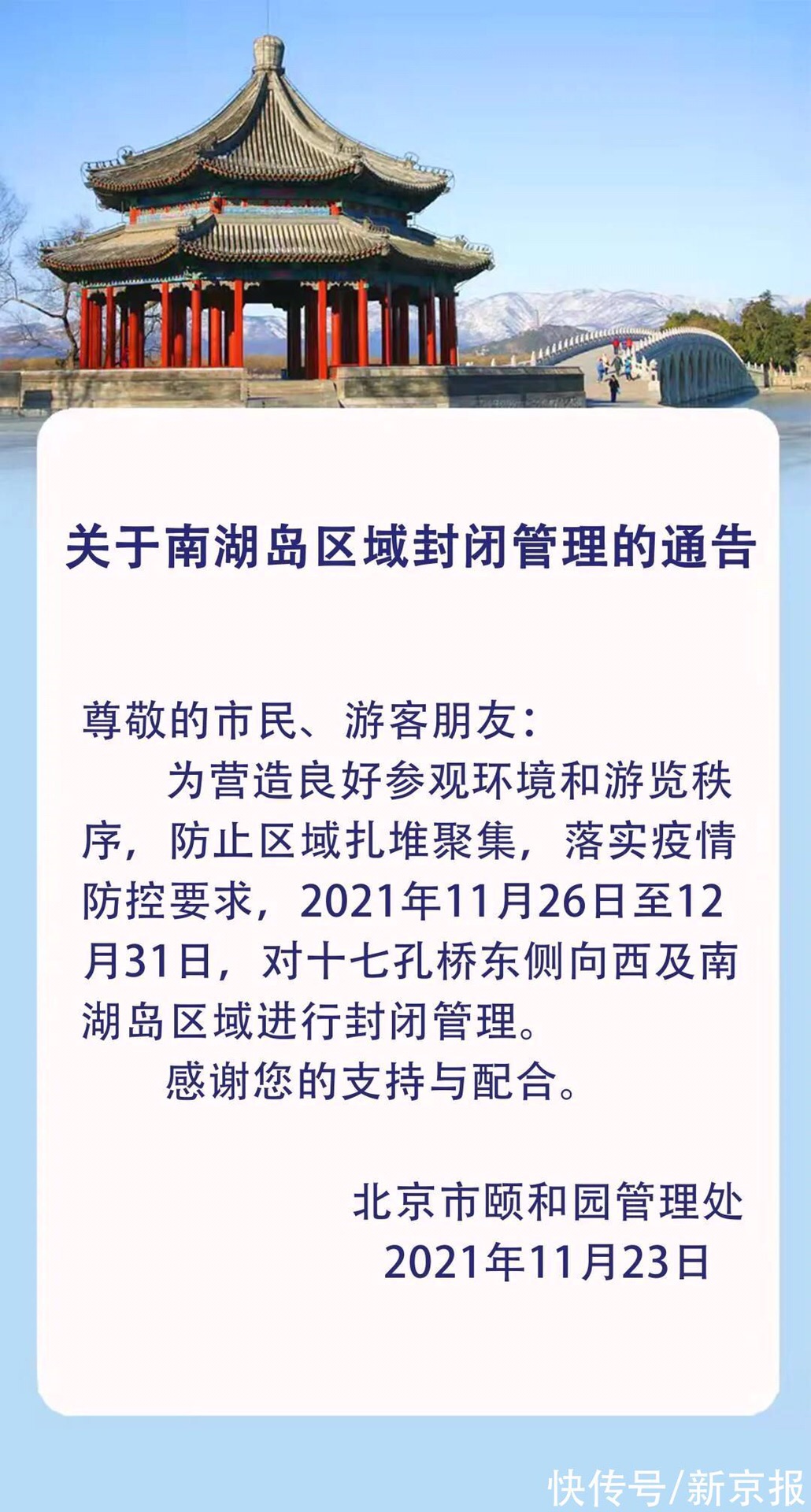 新京报快讯 23日,颐和园官微发布关于南湖岛区域封闭管理的通告。全文如下: