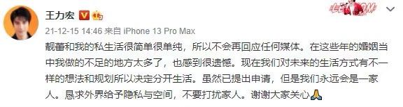 靓蕾和我的私生活很简单很单纯,所以不会再回应任何媒体。在这些年的婚姻当中我做的不足的地方太多了,也感到很遗憾。现在我们对未来的生活方式有不一样的想法和规划所以决定分开生活。虽然已提出申请,但是我们永远会是一家人。恳求外界给予隐私与空间,不要打扰家人。谢谢大家关心。