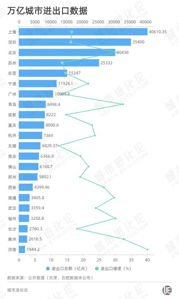 济南也成为24个万亿城市中,进出口增速最高的一个。青岛、泉州、北京、福州4城紧随其后,进出口增速均超过30%。