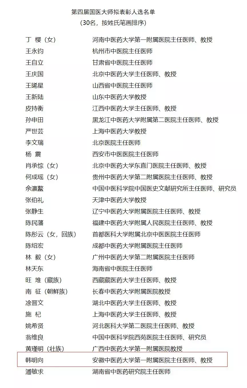 据国家中医药管理局消息,经逐级推荐和评审,并经第四届国医大师评选表彰工作领导小组审核,拟授予30人国医大师称号,现予以公示,公示期为2022年2月8日至2022年2月14日。天津中医药大学教授张伯礼等入选该名单。安徽1人入选。