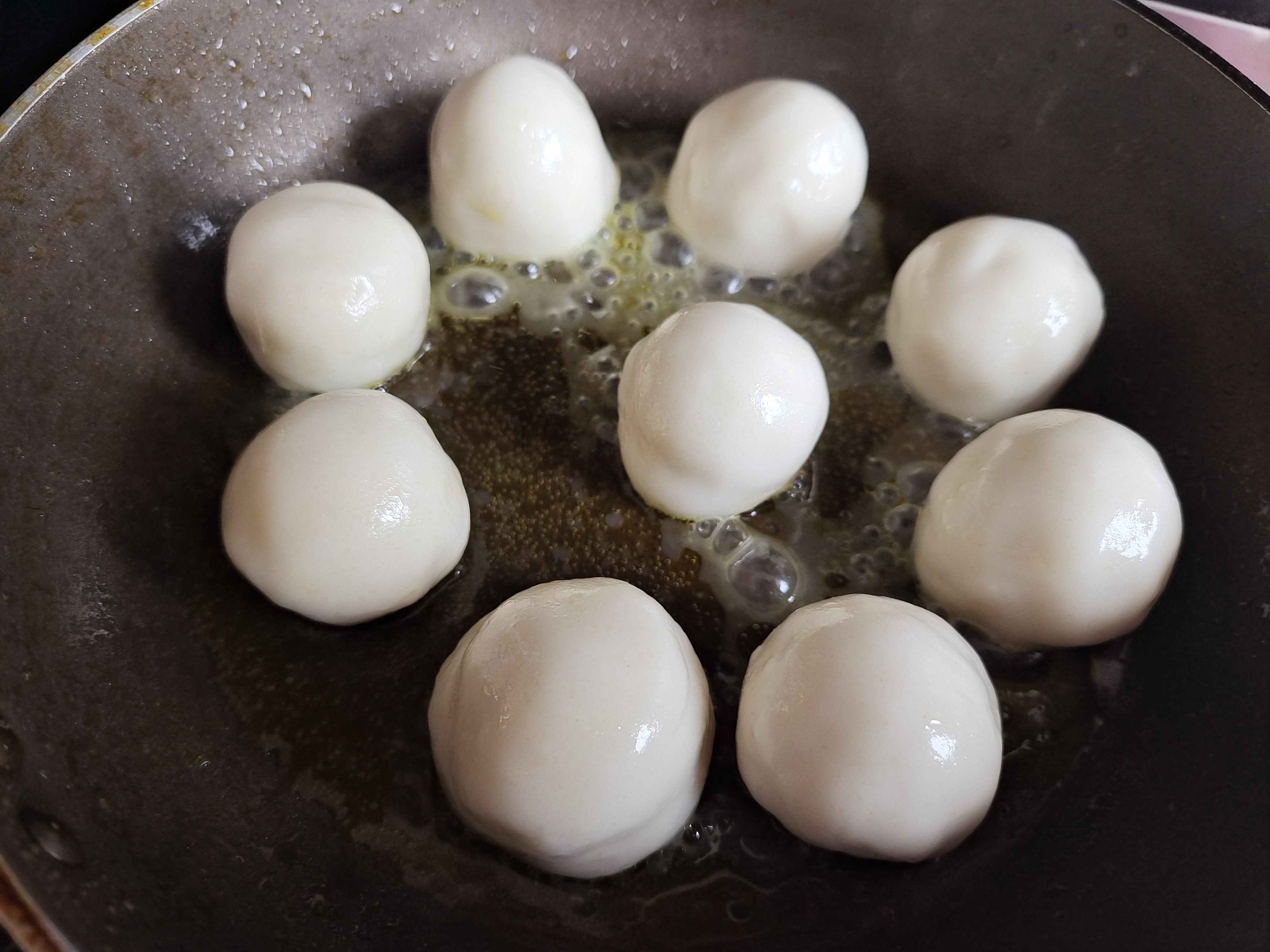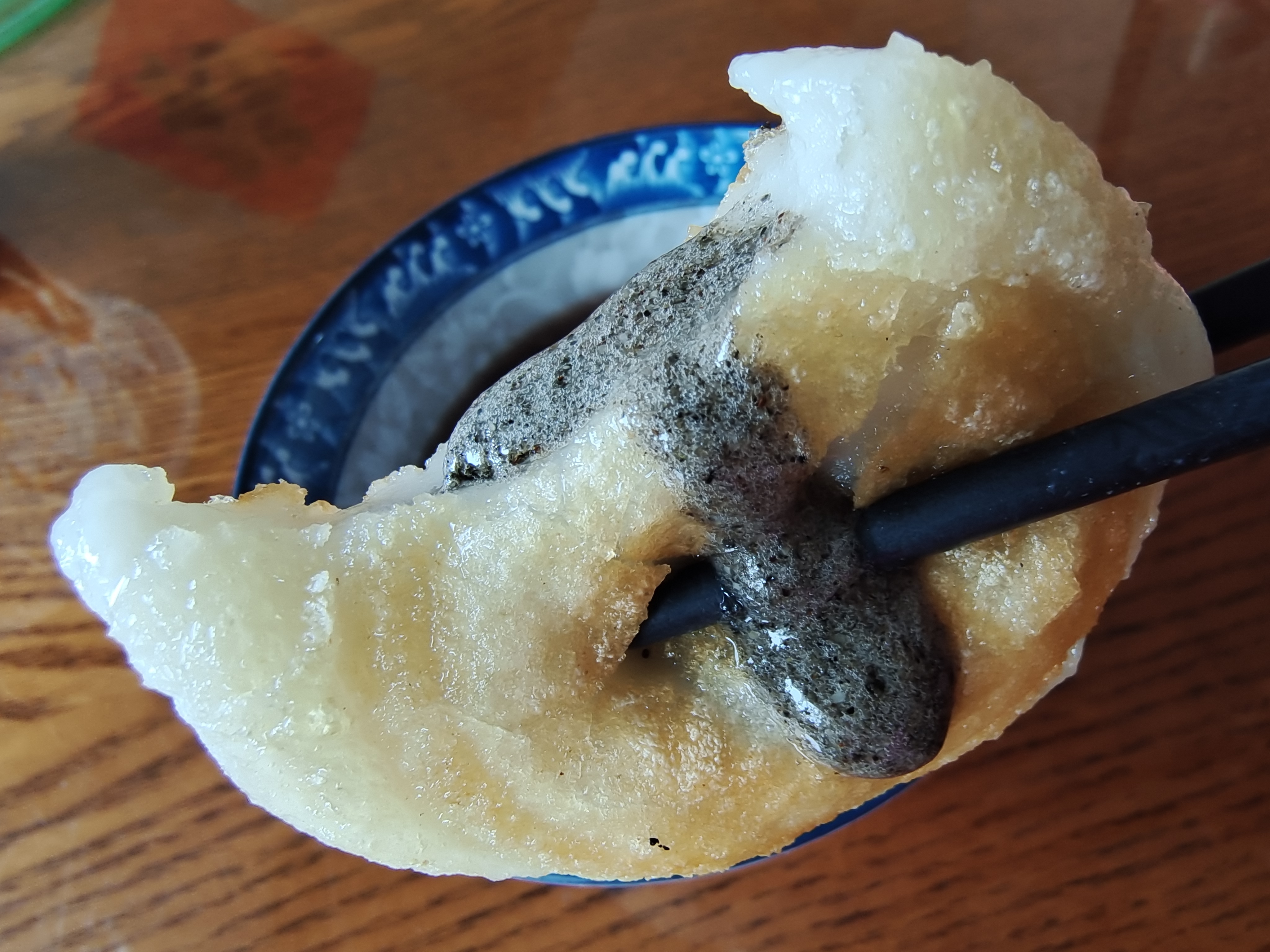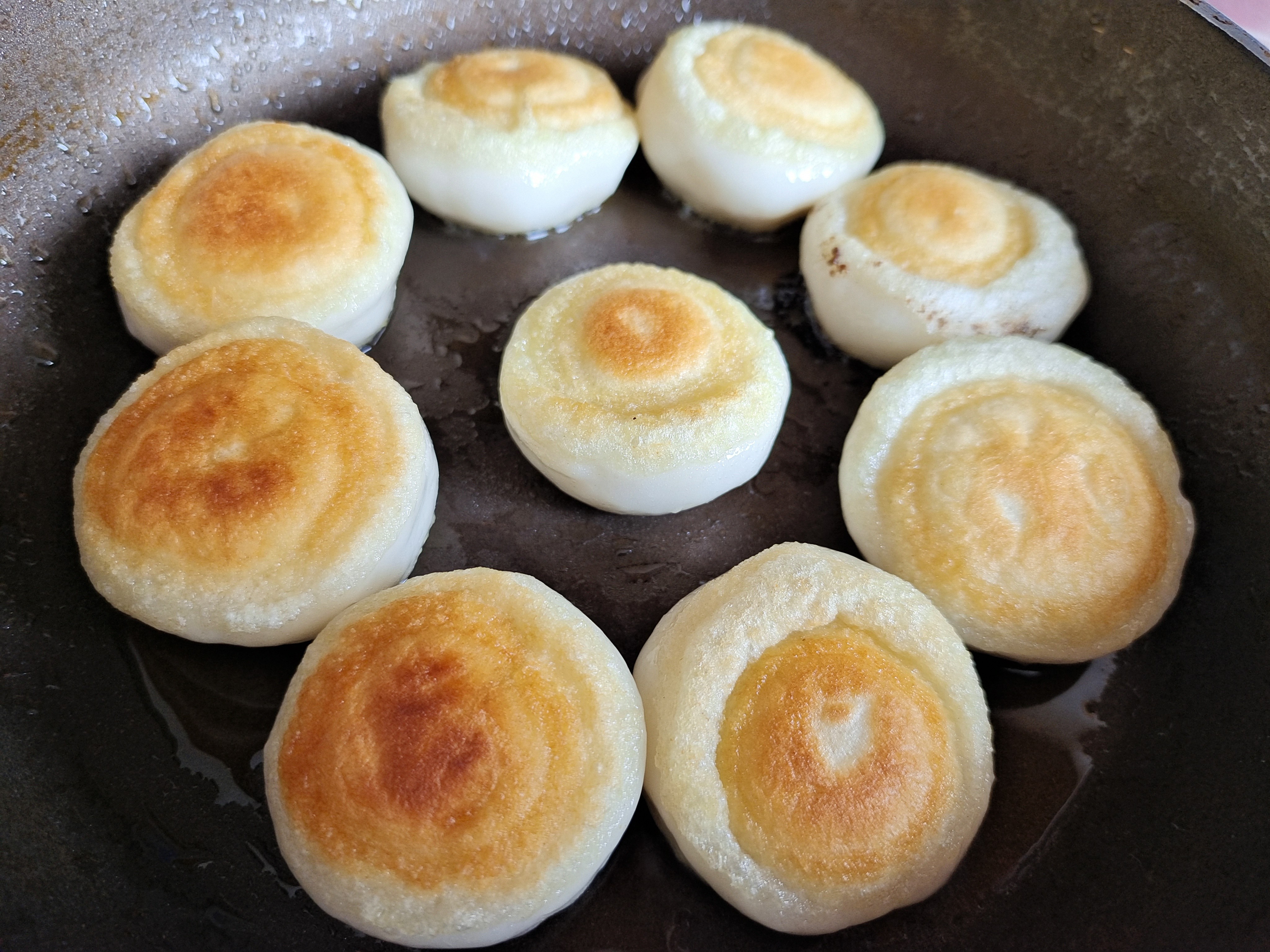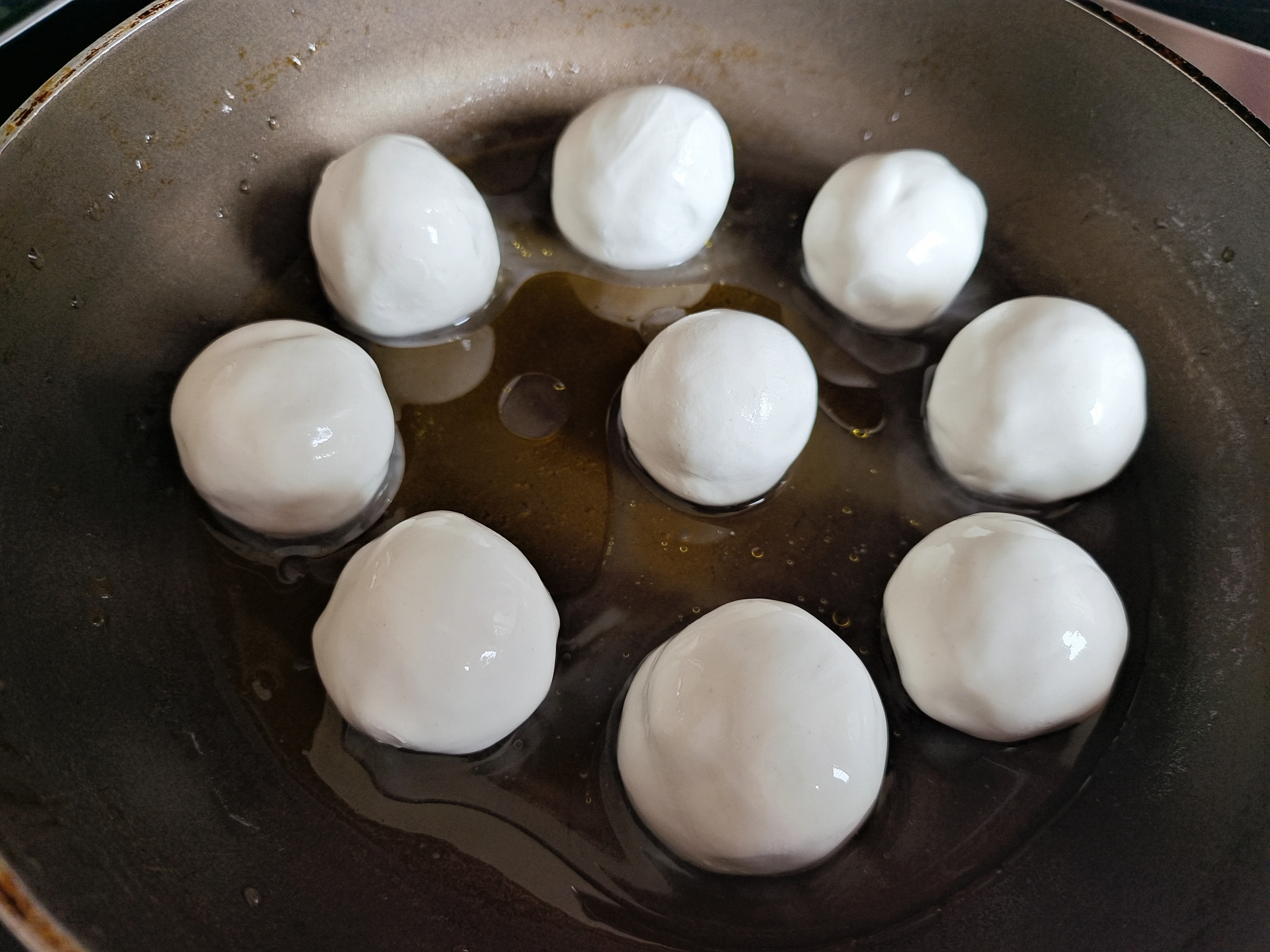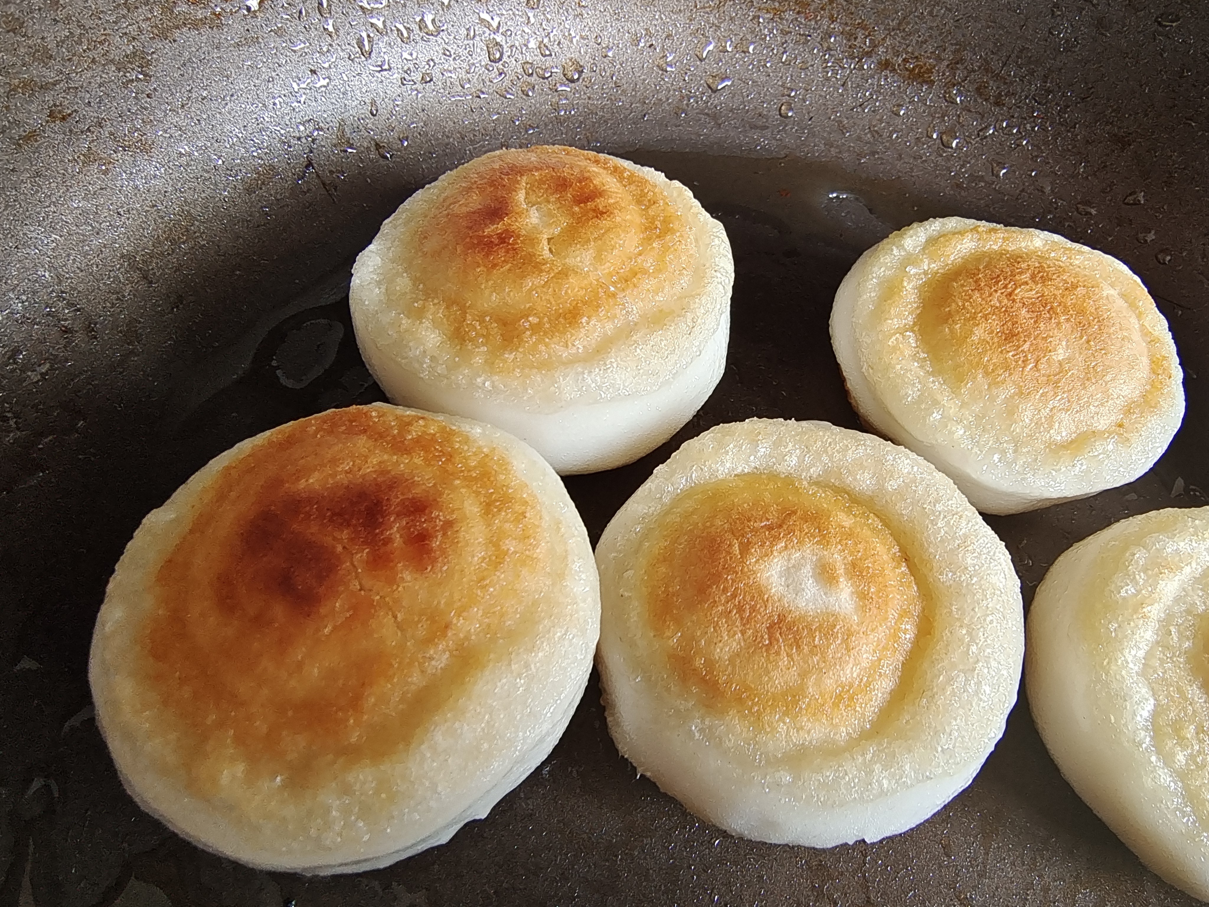 买的半成品汤圆外表又用纯糯米粉包裹一层,这样馅料不会在煎的过程中溢出来,糯米面的醇厚感也更强