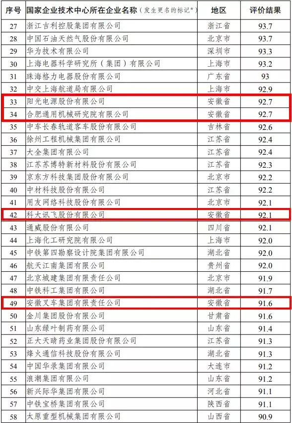 近日,国家发展改革委办公厅发布国家企业技术中心2021年评价结果,72家企业技术中心获评优秀。我省阳光电源股份有限公司、合肥通用机械研究院有限公司、科大讯飞股份有限公司、安徽叉车集团有限责任公司等4家入选。