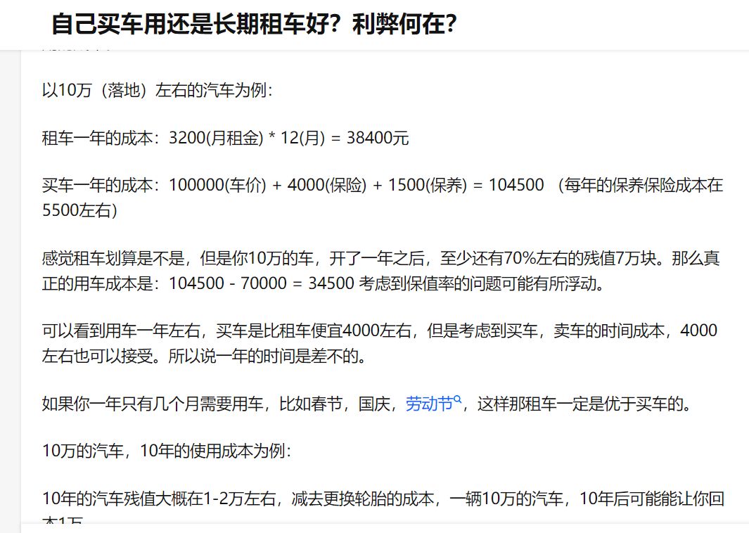 我平时上班骑电动车12分钟,雨雪天就打车、坐公交,按周末租车一天,每月租车2天,一年算25天,平时节节假日春节清明端午国庆元旦算20天租车,共计用车45天。考虑到买车要保养花时间精力,还有买车款,5万存银行,一年最少1500的利息收入。自己买车车辆一年的折旧费3000到