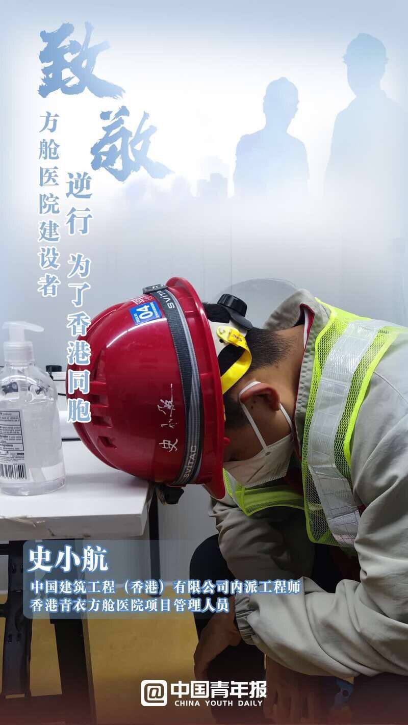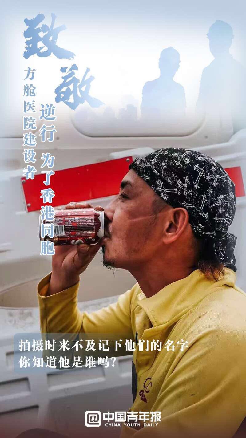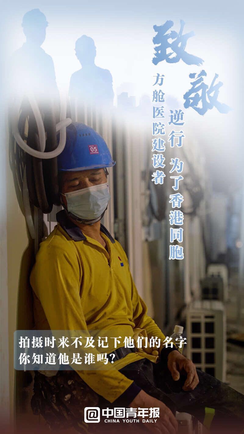 日晒雨淋间,戴着口罩的脸,捂成了两种颜色;双耳后侧,口罩勒痕反复摩擦,出血后留下了结痂;站在户外,手上捧着盒饭,眼睛望向的却是工地的进度;任何一处有支撑的物体,都能成为他们累极了的依靠。这群人中,有内地员工,也有香港员工,更有00后……面临香港不断攀升的新冠确诊人数,他们甚至来不及与家人告别,就奔赴工地,披星戴月赶建出一座座中央援港方舱医院。在这里,建设者只有一个共同的目标——抢救生命,建设希望。致敬,辛苦!