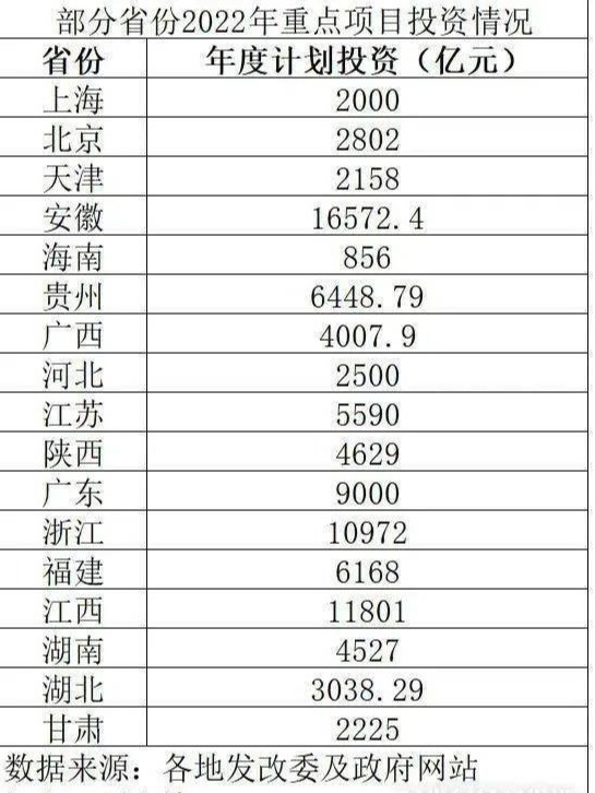截至目前,全国已有19个省份公布了2022年重点项目投资计划清单,包括北京、上海、天津、广东、江苏、浙江、四川、贵州、河北、安徽等。其中,安徽、江西、浙江三省年度计划投资均超万亿元。