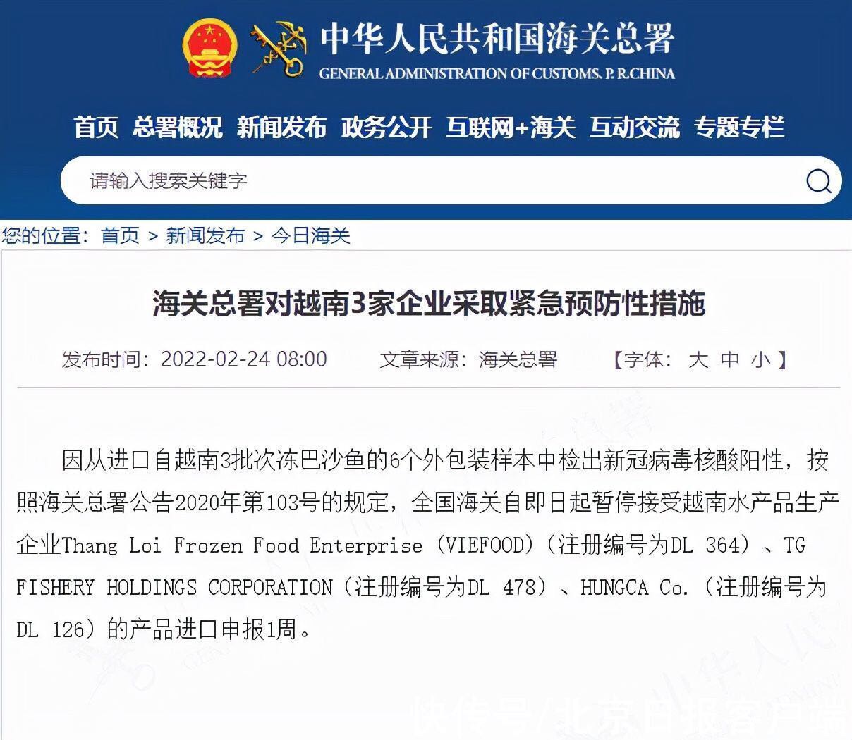 据海关总署官网消息,因从进口自越南3批次冻巴沙鱼的6个外包装样本中检出新冠病毒核酸阳性,按照海关总署公告2020年第103号的规定,全国海关自即日起暂停接受越南水产品生产企业Thang Loi Frozen Food Enterprise (VIEFOOD)(注册编号为DL 364)、TG FISHERY HOLDINGS CORPORATION(注册编号为DL 478)、HUNGCA Co.(注册编号为DL 126)的产品进口申报1周。