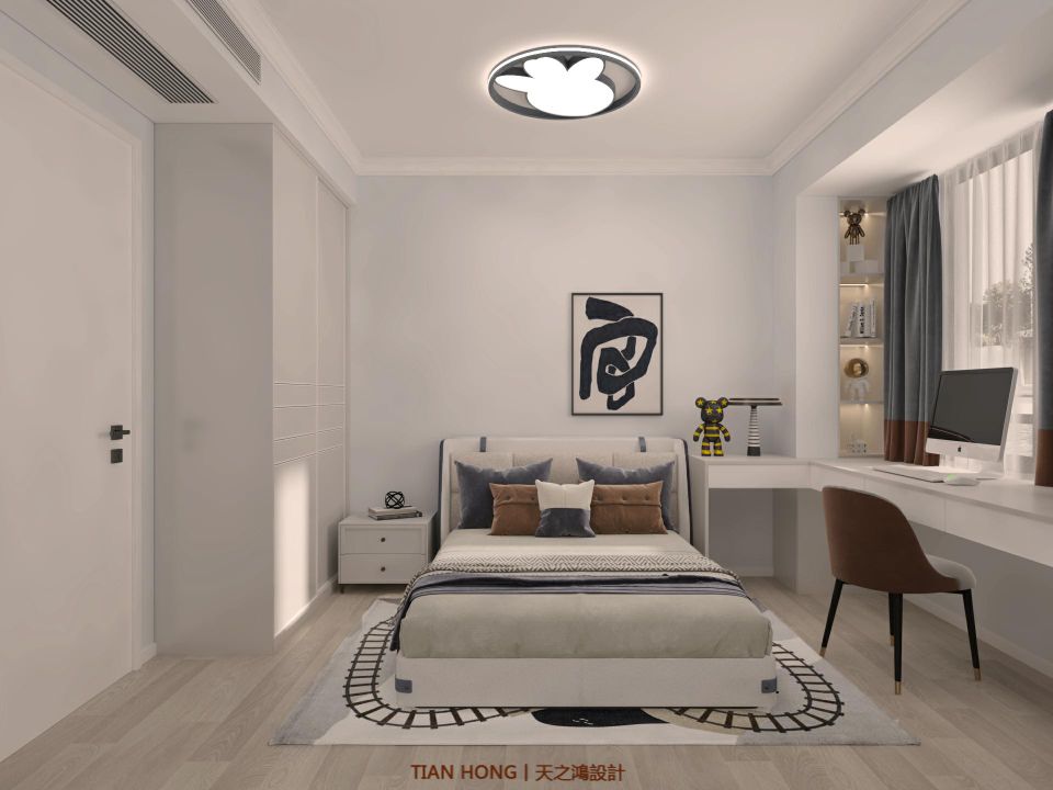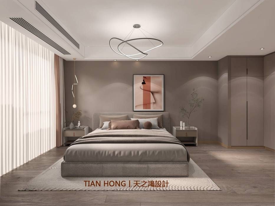 4、照明应用卧室照明一般分为基础照明和气氛照明。基础照明一般是灯带或主灯设计,气氛照明一般设计壁灯、筒灯、落地灯、台灯。为了不让光线直接照射到眼睛上,应该选择少晃眼的乳白色半透明型照明器具。