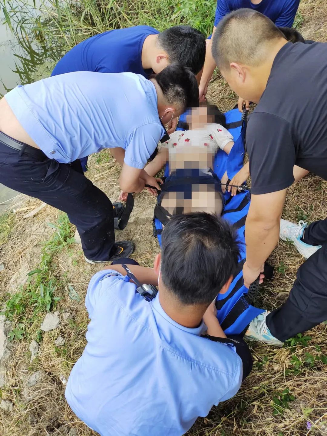 很快,消防队员与120急救车辆赶到现场。确认女子并无生命危险后,民警与消防队员合力使用担架将女子抬上路面,并送上120急救车辆。
