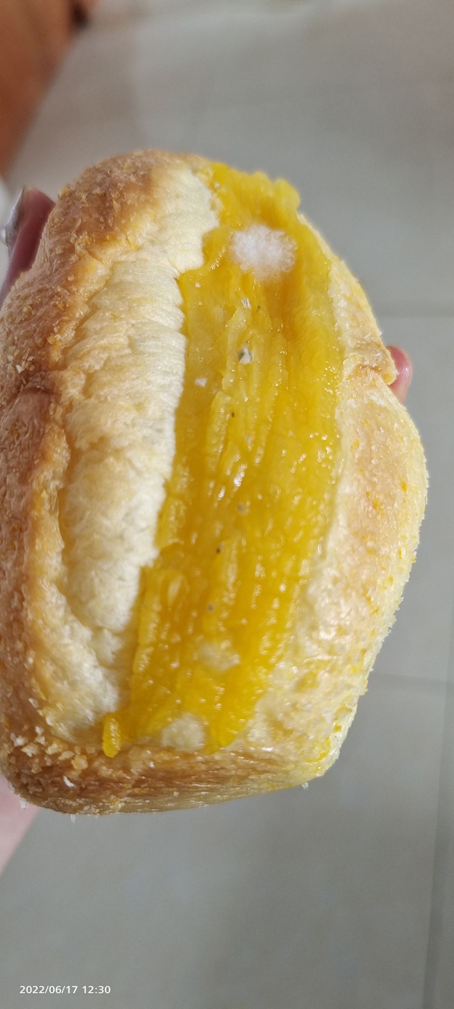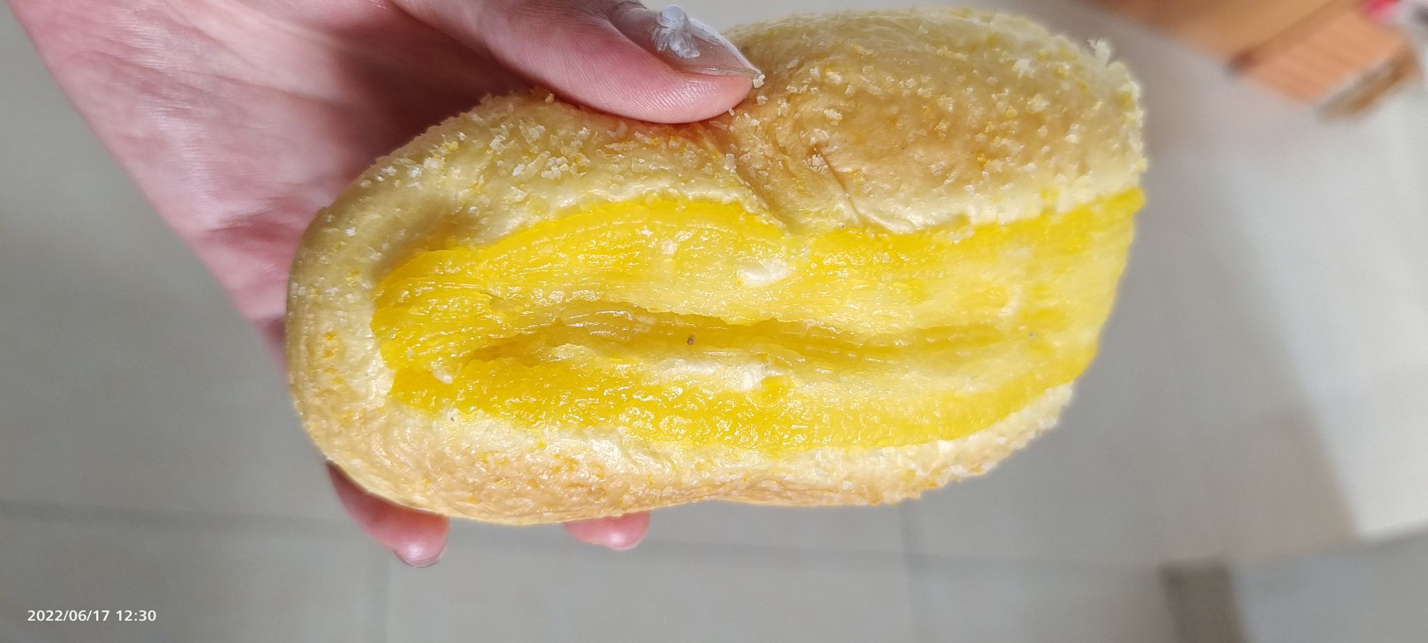 今早看着手机吃了一个,没对味道特别在意,后来放下手机嘴巴里的味道隐约觉得还是有些不对。这才开始拎起袋子对面包前后看了起来。