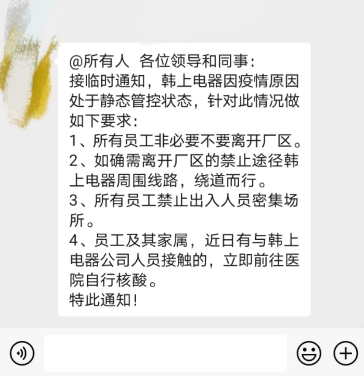 [焦点话题] 滁州韩上电器什么情况?所有员工非必要不离开厂区,处于静态管控状态! |