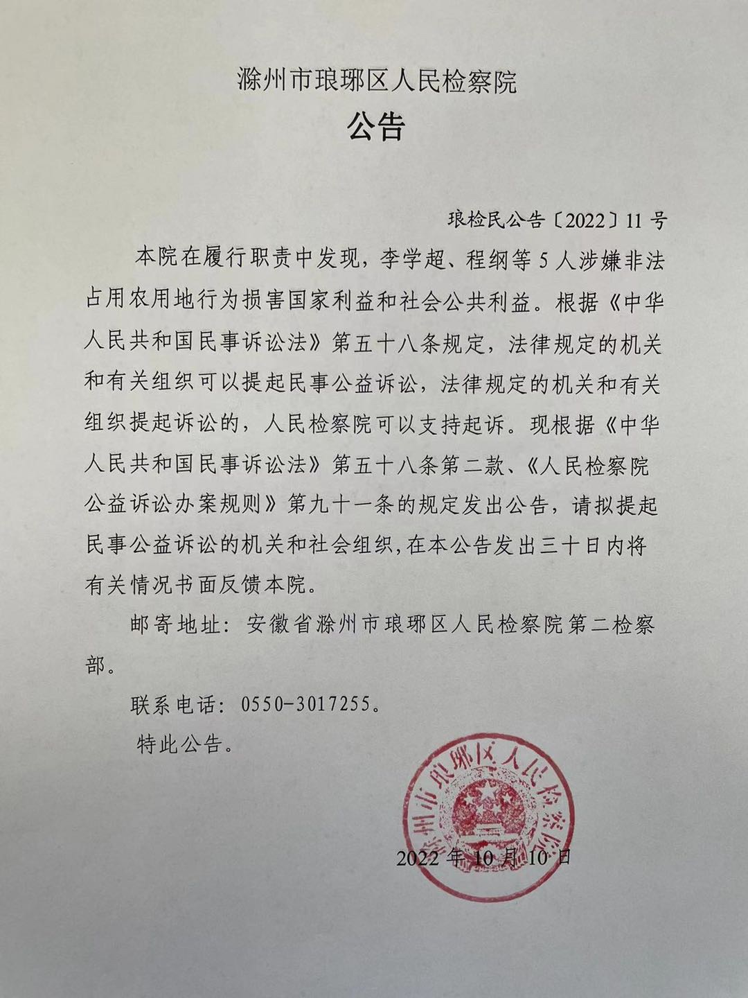 本院在履行职责中发现,李学超、程纲等5人涉嫌非法占用农用地行为损害国家利益和社会公共利益。根据《中华人民共和国民事诉讼法》第五十八条规定,法律规定的机关和有关组织可以提起民事公益诉讼,法律规定的机关和有关组织提起诉讼的,人民检察院可以支持起诉。现根据《中华人民共和国民事诉讼法》第五十八条第二款、《人民检察院公益诉讼办案规则》第九十一条的规定发出公告,请拟提起民事公益诉讼的机关和社会组织,在本公告发出三十日内将有关情况书面反馈本院。