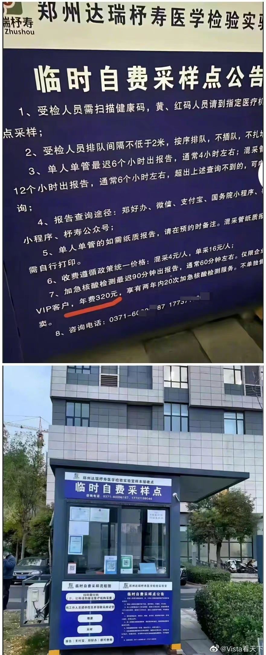 【#郑州一核酸采样点推出VIP服务#,年费320元】据网友爆料,近日,河南郑州惠济区一临时自费采样点贴出公告,公告表示:加急核酸检测最迟90分钟可出报告,但仅限企业vip客户,年费为320元,并享有两年内20次加急核酸检测服务,不单独售卖。