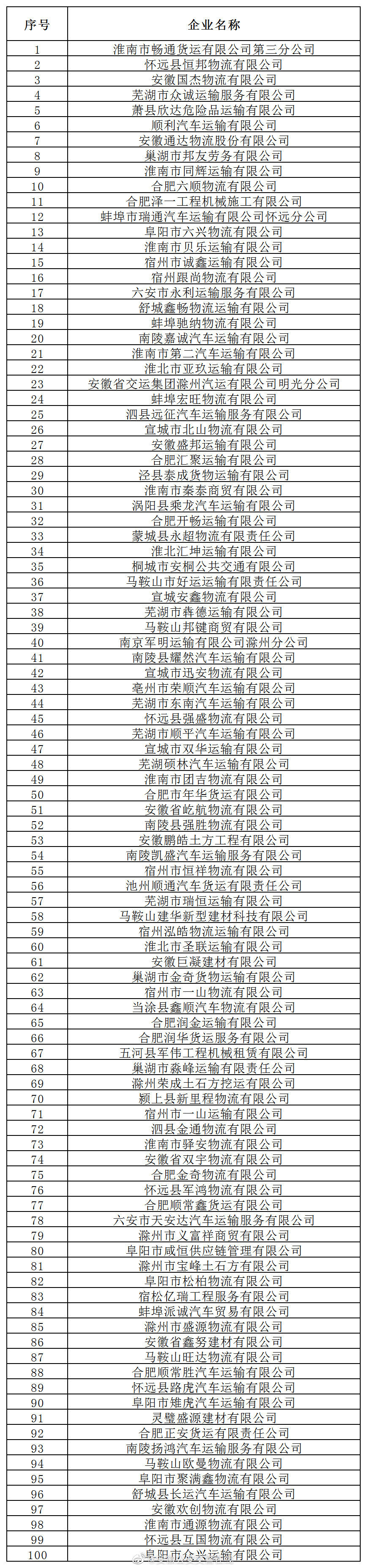 为深入推进道路交通事故预防“减量控大”工作,公安部交通管理局根据机动车和驾驶人相关指标,确定了一批交通安全高风险运输企业。11月16日,安徽省公安厅交警总队对2022年10月份全省交通安全高风险的100家运输企业予以曝光,督促相关企业落实主体责任,尽快消除交通安全风险隐患,保障道路通行安全。