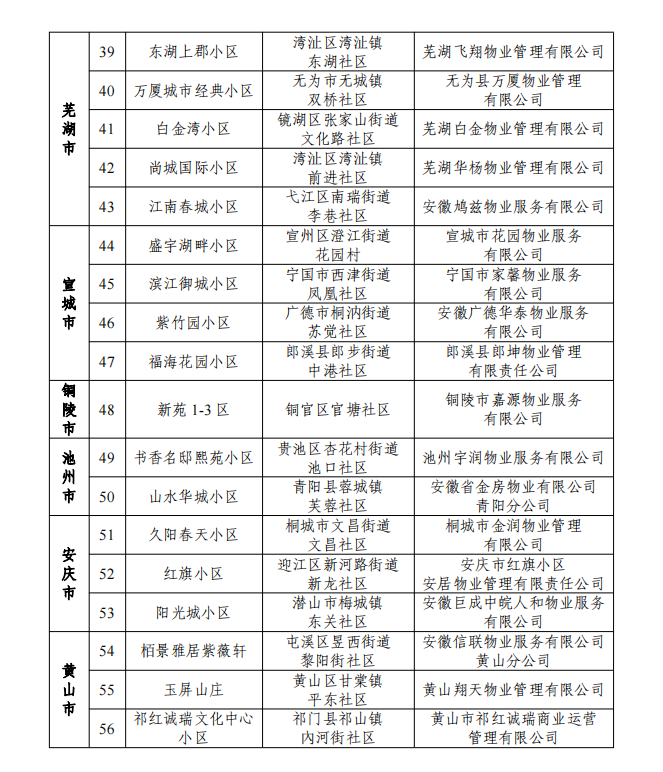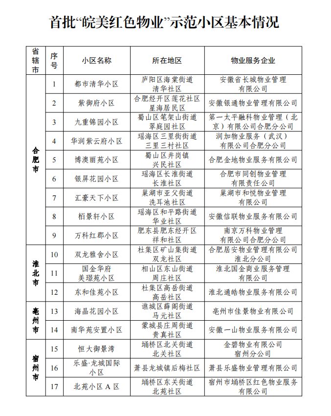 为解决好物业服务管理这一居民群众天天有感的关键小事,今年3月省委组织部会同省住房和城乡建设厅制发《安徽省“皖美红色物业”建设三年行动方案》,并指导推动各地各街道社区各小区对照《“皖美红色物业”小区建设指引》开展对标建设,涌现出了一批物业服务企业履职到位、业主委员会运行规范、社区和小区党组织作用发挥充分、治理成效明显的住宅小区。 为鼓励先进、激发动力,充分发挥典型示范引领作用,进一步推动全省“皖美红色物业”建设工作,在各级层层推荐、审核把关、集中公示的基础上,省委组织部、省住房和城乡建设厅决定命名合肥市庐阳区海棠街道清华社区都市清华小区等56个小区为首批“皖美红色物业”示范小区。 具体名单如下:
