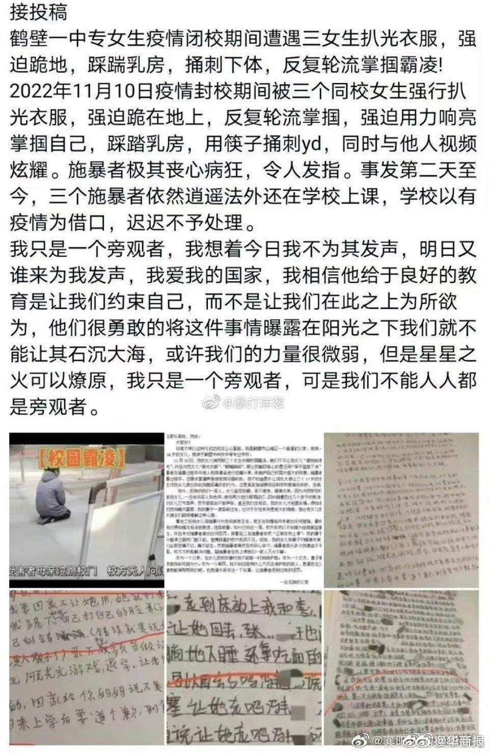 【官方通报:鹤壁霸凌事件涉案人员已被采取刑事强制措施】11月18日,河南鹤壁一则中专女生被3名女生校园霸凌甚至羞辱的文章引网友关注。文章中,一网友以父亲的身份控诉,称女儿被长期霸凌威胁,遭到“跪地自扇耳光”“脱光衣服”“脚踹胸部”,甚至还被“筷子猛插下体”等暴力侵犯。据了解,施暴者在暴力实施过程中与他人视频通话进行炫耀分享,来维护自己校园大姐大的形象,还要求掌掴声音被视频对面听到。该网友表示,现在女儿和妻子均精神失常,而三名施暴者依然正常在学校上课。