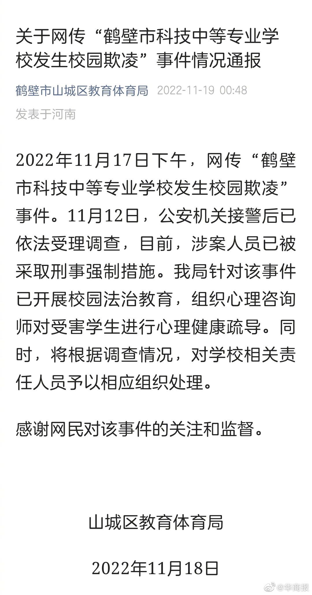 11月19日,鹤壁市山城区教育体育局发布情况通报称,11月12日,公安机关接警后已依法受理调查,目前,涉案人员已被采取刑事强制措施。针对该事件已开展校园法治教育,组织心理咨询师对受害学生进行心理健康疏导。同时,将根据调查情况,对学校相关责任人员予以相应组织处理。