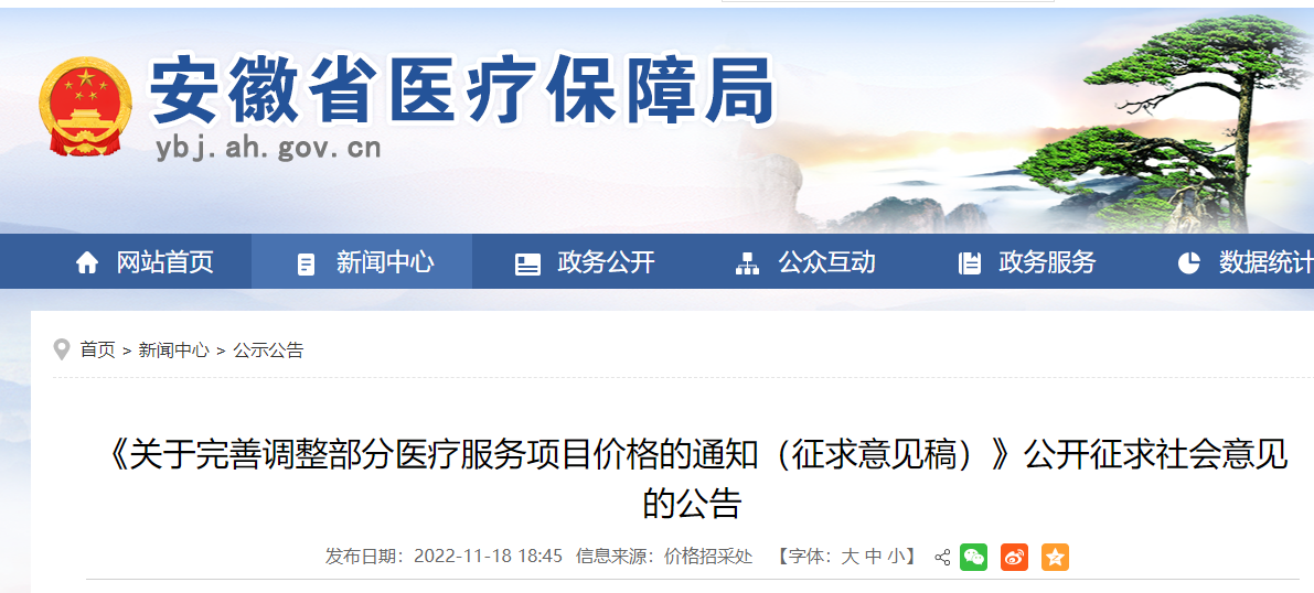 18日,安徽省医保局发布公告,就完善调整部分医疗服务项目价格,向社会公开征求意见。