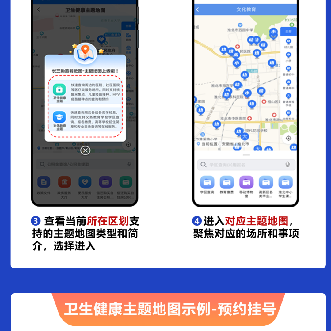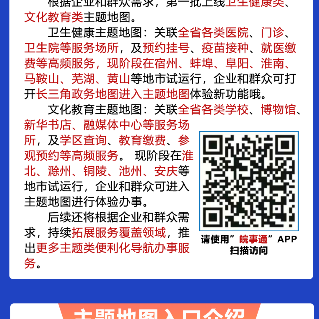 据了解,卫生健康类主题地图既有空间位置、又有服务事项,既能查询、又能办事,群众可以快速查询周边各级医疗服务场所相关信息,线上线下导航办理各类高频服务。目前蚌埠、芜湖、马鞍山、淮南、黄山、阜阳、宿州等7个地市已上线试点运行,后期将在全省推广应用。