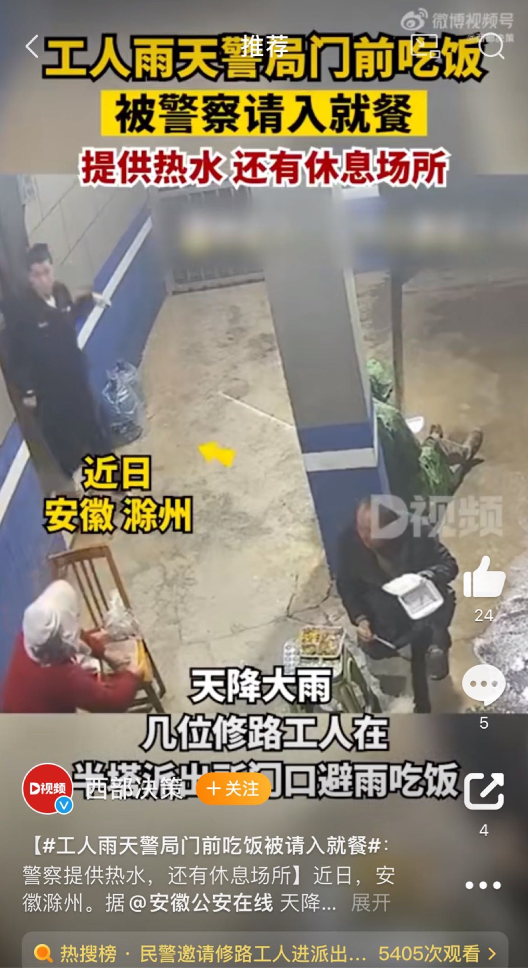 近日,安徽滁州,天降大雨,几位修路工人在半塔派出所门口避雨吃饭。民警看到这一幕,热情邀请工人们进警局,到宽敞的警民调解室就餐,还给他们提供了热水。就餐完毕,工人们细心地收拾干净桌面,随后离开。