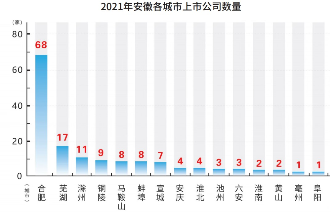 上市公司是区域经济发展的“晴雨表”。截止2021年底,合肥上市公司数量达到68家,在省内遥遥领先,在全国内地289个城市排名居第14位;芜湖和滁州上市公司数量分别为17家、11家。
