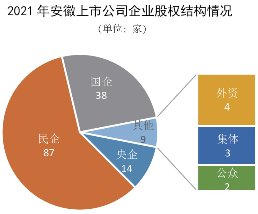 从股权结构分布上看,截至2021年底,安徽A股上市公司民企有87家,国企有38家,央企有14家,其他企业有9家。新增上市公司中,17家是民企,4家是国企,1家是外资。近几年,安徽民企成为上市“主力军”。