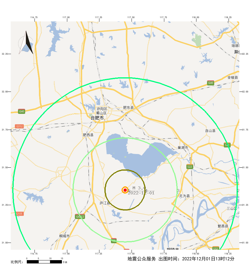 据地震台网测定22-12-0112:57:47安徽合肥市庐江县(117.45°,31.35°)发生3.0级地震,震源深度8千米。本次地震极震区烈度预计达到5度,影响场受相应断裂带控制。震中位于庐江县盛桥镇附近,通过大数据分析,震中5千米范围内常住人口估算有10500人左右,每平方千米约有419人。