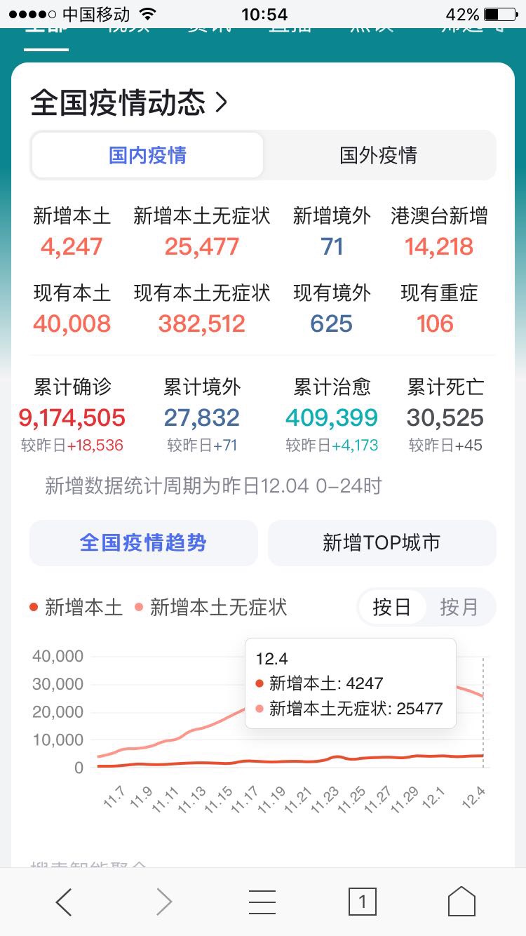截至12月4日24时,据31个省(自治区、直辖市)和新疆生产建设兵团报告,现有确诊病例40633例(其中重症病例106例),累计治愈出院病例294615例,累计死亡病例5235例,累计报告确诊病例340483例,无现有疑似病例。累计追踪到密切接触者14041128人,尚在医学观察的密切接触者1979618人。
