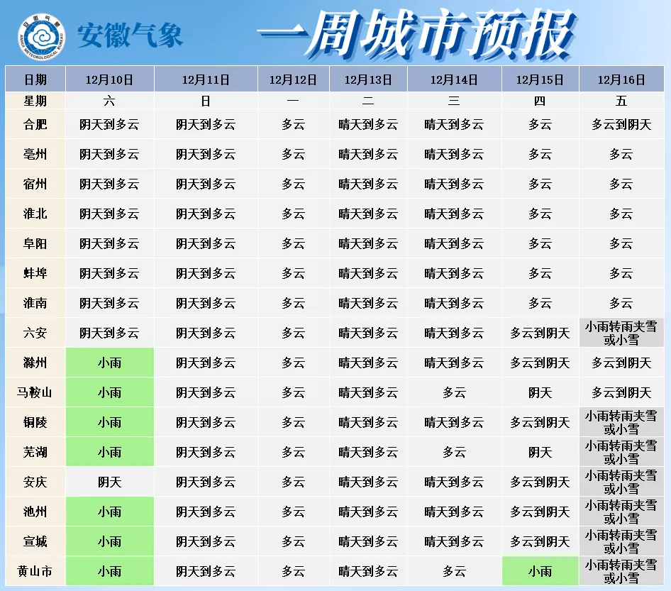 未来一周,冷空气活动频繁。其中今日受弱冷空气影响,全省偏北风力增至3~4级,阵风7级左右,11日早晨大别山区和淮北地区最低气温:-4~-2℃,江南北部0~2℃,江南南部3~5℃,其他地区0℃左右。13日前后、15-16日还将有两股冷空气影响我省。