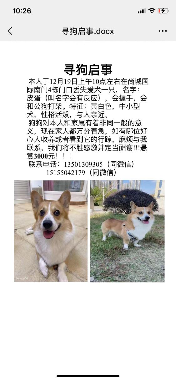 狗狗对本人和家属有着非同一般的意义,现在家人都万分着急,如有哪位好心人收养或者看到它的行踪,麻烦与我联系,我们将不胜感激并定当酬谢!!!悬赏3000元!!!