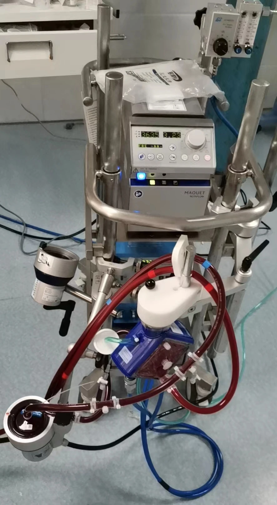随着ECMO的开始运转,患者体内暗红色血液从静脉导管引出,然后经过膜肺氧合,鲜红的血液再次重新输入到他的体内。