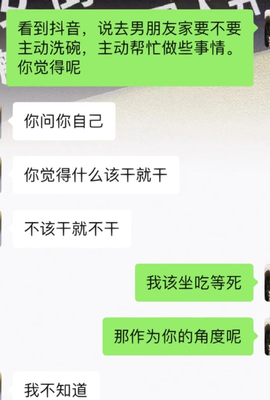 我不知道所以他什么意思?我的想法就是:在家不勤快,去男朋友家也没必要装勤快。
